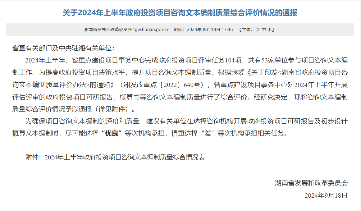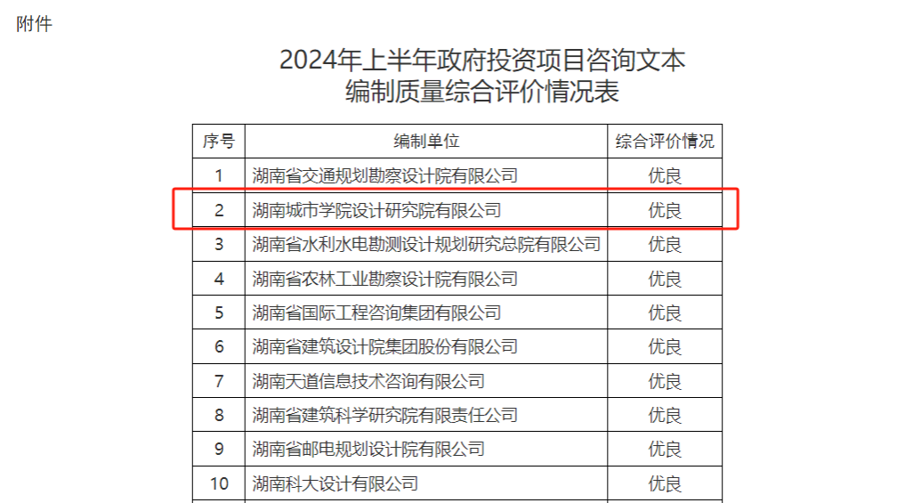 9月18日,湖南省发展和改革委员会发布《关于2024年上半年政府投资项目咨询文本编制质量综合评价情况的通报》,2024年上半年,省重点建设项目事务中心完成政府投资项目评审任务104项,共有53家单位参与项目咨询文本编制工作,省重点建设项目事务中心对2024年上半年开展评估评审的政府投资项目可研报告、概算书等咨询文本编制质量进行了综合评价。乐动网站设计研究院有限公司获评优良(排名第二)。
