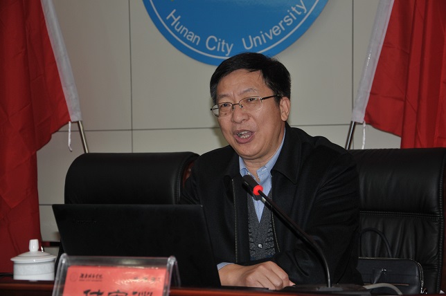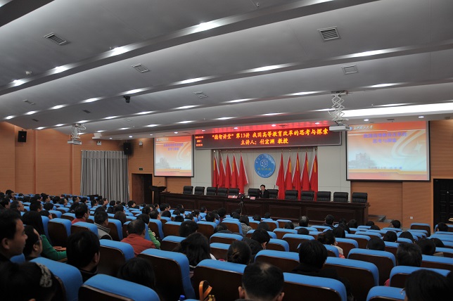 (本网讯)11月25日下午,学校在逸夫图书馆报告厅举行德智讲堂第13讲,特邀长沙理工大学党委书记付宏渊教授做题为《关于高等教育改革的思考》的专题辅导报告。学校副科级以上干部,党总支部、直属支部委员,教工党支部书记,学生党支部书记,马克思主义学院全体教师,机关党总支部全体党员等300余人出席报告会。报告会由党委书记