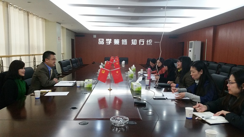 博士一行应邀访问我校。国际交流处全体人员、商学院领导及相关人员在办公楼一会议室热情接待了美国来访客人。