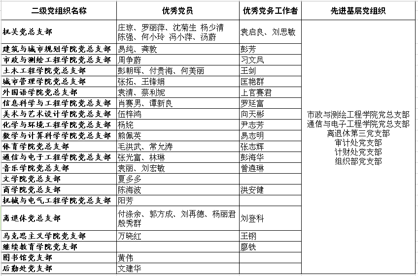 经评选,学校在教工党员、二级基层党组织和教工党支部中拟表彰2014-2015年度优秀共产党员40名、优秀党务工作者18名和先进基层党组织6个;拟推荐中共益阳市委教育工委优秀共产党员4名、优秀党务工作者2名。现将评选结果(名单见附件)予以公示,公示时间为2015年6月26日至2015年6月30日,若有异议,请与纪委监察处或党委组织部联系。