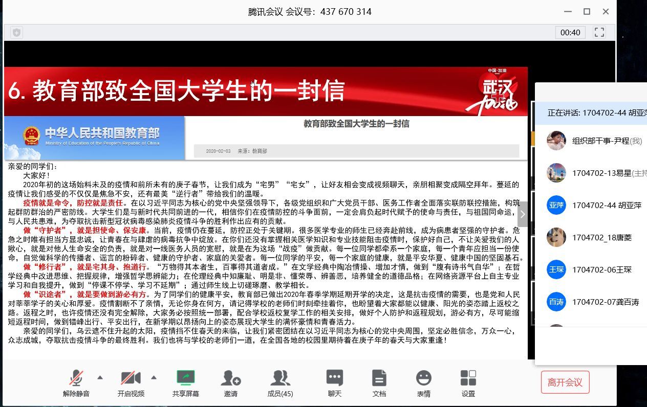 在当前新冠肺炎疫情防控的关键时期,为充分发挥基层团组织的战斗堡垒作用,引导广大青年学生积极抗击疫情,锤炼意志品行,提升自我,2020年3月22日19:00,管理学院通过腾讯会议平台开展了以“众志成城,共抗疫情”为主题的线上政治学习。