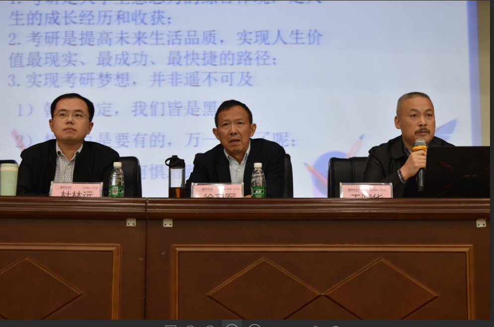 会议第一项王润华教授分别讲述了学生为什么要考研、考研之路的常见问题等。他强调考研是大学生意志力的综合体现,考研过程充分反映了大学生的自我学习能力,鼓励在座的各位要有毅力、有恒心,做有理想敢拼搏的当代大学生。会议第二项杜林远博士谈到如何选择学校专业,提醒学生谨慎选择院校专业,不可好高骛远,更要协调处理好所学课程与考研的两件事。他还建议考研学习要保持良好的心态,注重效率。会议第三项考研班主任代表黄彪老师谈到了自己所在研究生母校多数人都是从普通本科,一步一步通过自己努力考上研究生,告诫大家不要对自己失去信心,别人能行,自己肯定也没问题。会议第四项学生代表罗荣威从考研决心和考研目标进行展开,表示考研是一场马拉松,没有坚定的决心和明确的目标很难到达终点,我们大学生要树立正确的考研目标,勇往直前。最后徐习军教授总结发言,他表示考研重过程,走向考场就是胜利,考研是形势所需也是提升个人能力的选择,鼓励大家报考。他引用习近平总书记在北京大学师生座谈会上的一段话来寄语学生。“广大青年既是追梦者,也是圆梦人。追梦需要激情和理想,圆梦需要奋斗和奉献。广大青年应该在奋斗中释放青春激情、追逐青春理想,以青春之我、奋斗之我,为民族复兴铺路架桥,为祖国建设添砖加瓦。”