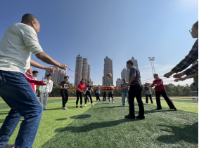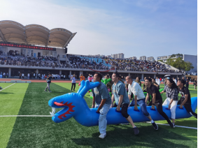 11月3日,学校第六届体育文化节&教职工趣味运动会在东田径场顺利举行。运动会共安排有4个教职工趣味比赛项目:50米迎面接力、旱地龙舟、螃蟹背西瓜、同心击鼓。